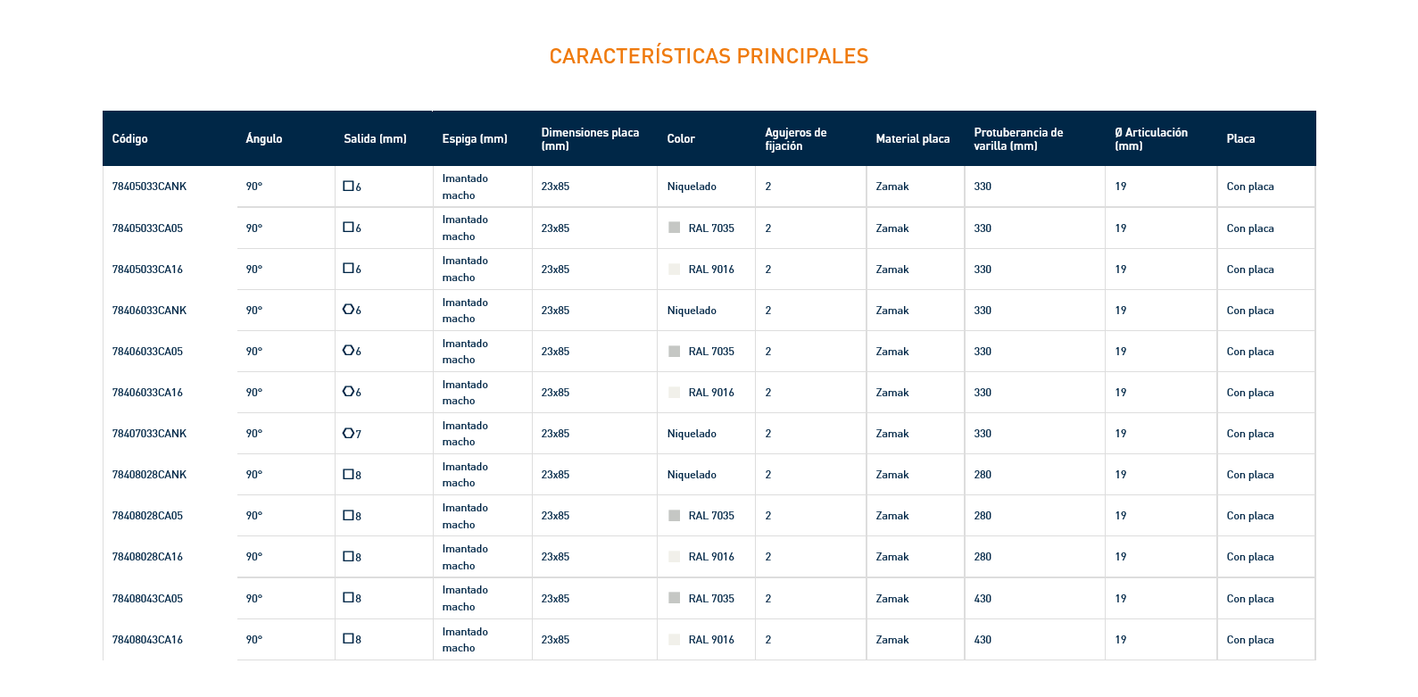 - Articulación Zamak lacado o niquelado.