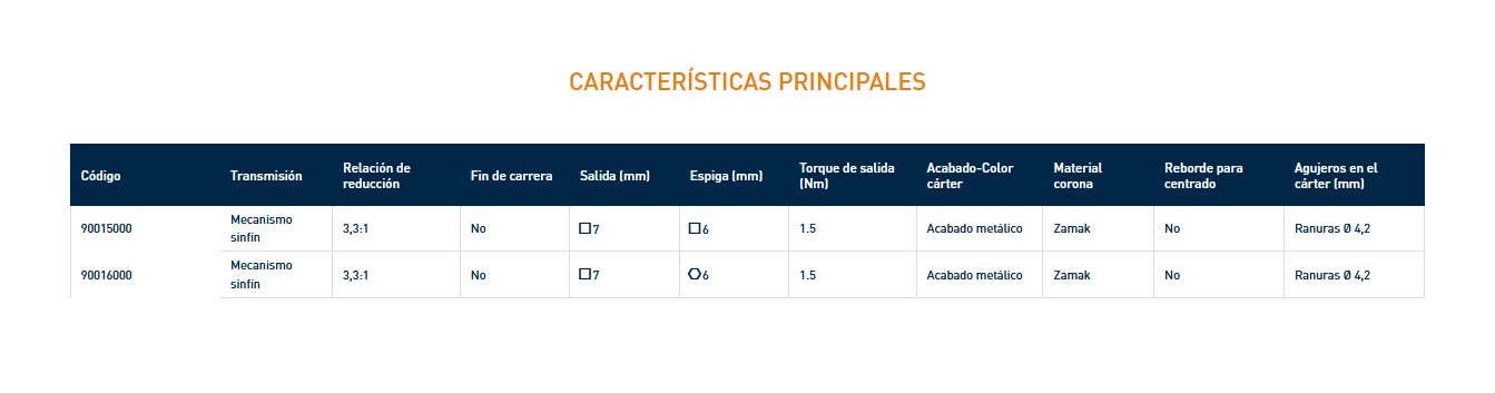 Mecanismo sinfín. Reducción 3,3:1 Cárter en Zamak. Sinfín en latón. Corona en Zamak. Autofreno...