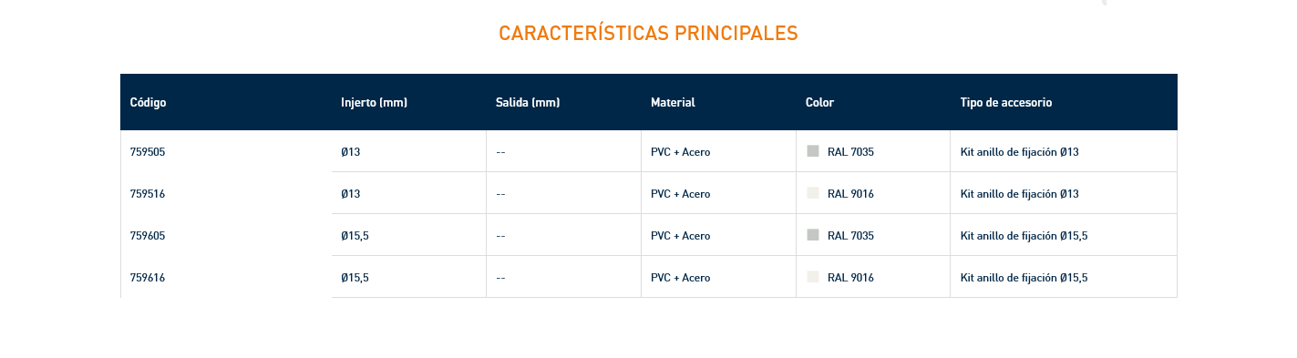 Anillo de fijación Material plástico. Pasador en acero Inox Ø 3,9. DESCARGAR FICHA TÉCNICA